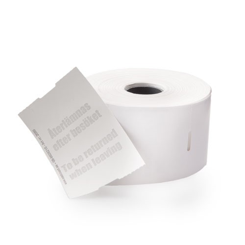 - Baksidestryck med texten "Återlämnas efter besöket - to be returned when leaving"